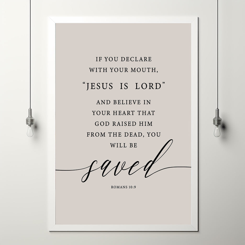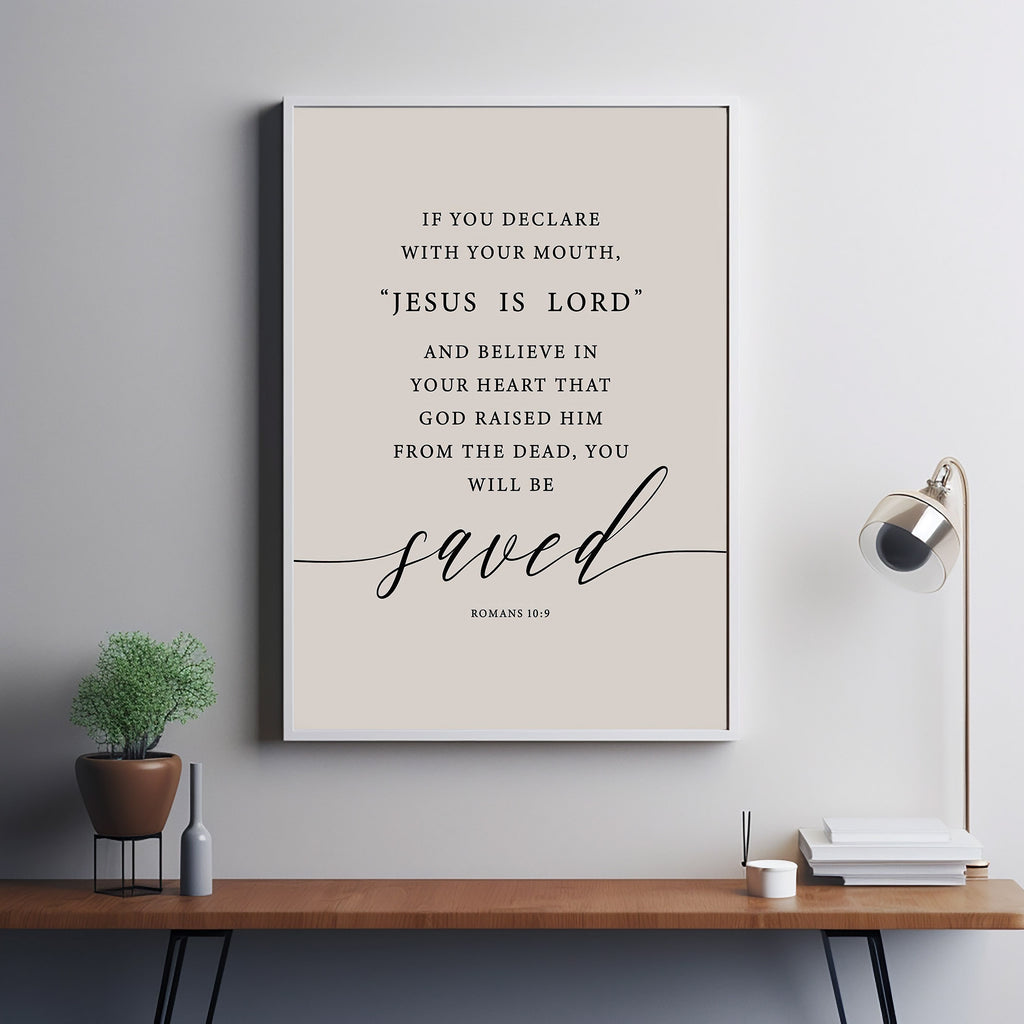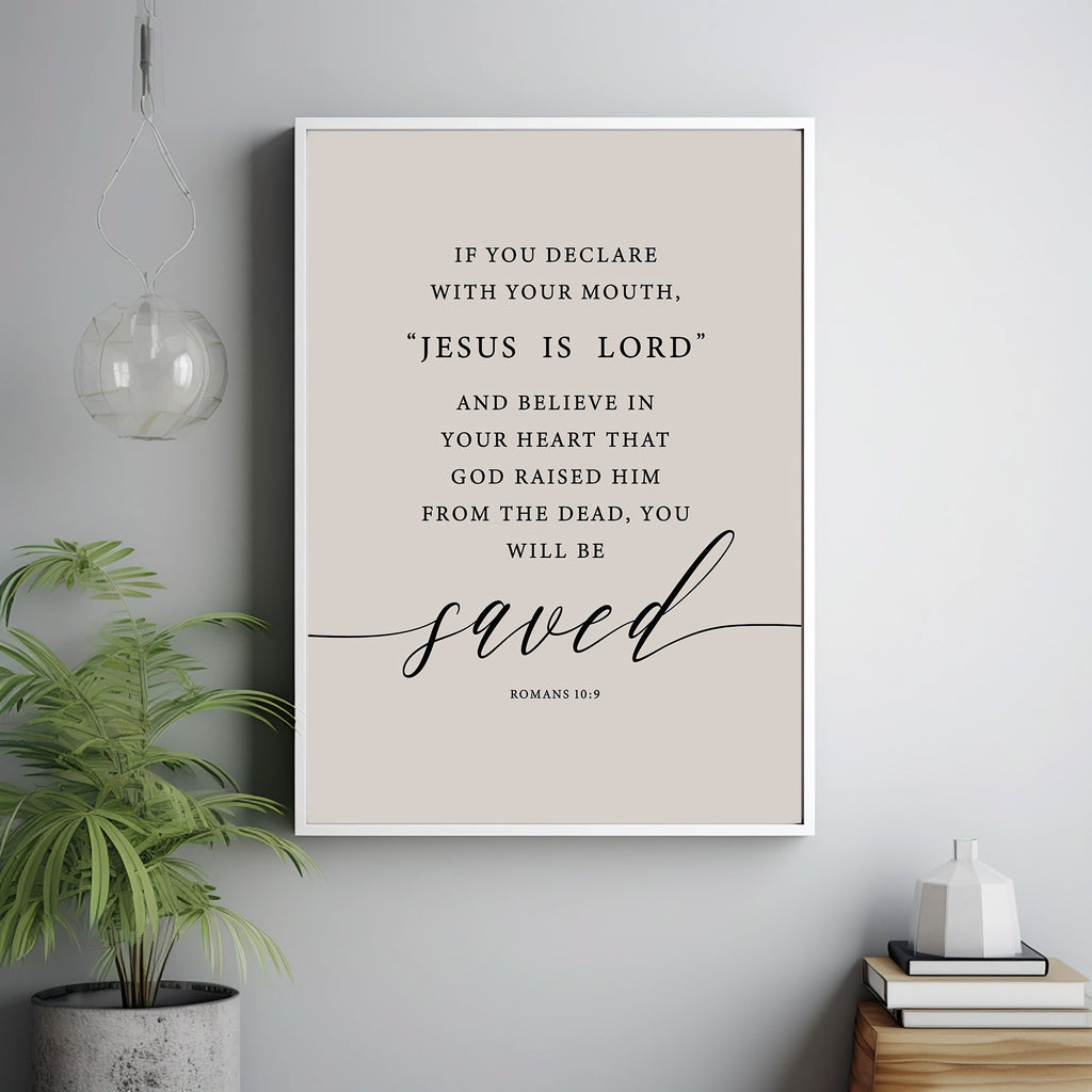 The artwork elegantly displays the verse from Romans 10:9, "If you declare with your mouth, 'Jesus is Lord,' and believe in your heart that God raised him from the dead, you will be saved." This profound statement is a cornerstone of Christian belief, making this poster a poignant and uplifting choice for any room, serving as a reminder of the hope and redemption offered through faith in Jesus Christ.